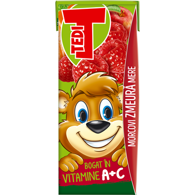 Apă, piureuri (40%) din: morcovi (36%), mere (3%) şi zmeură (1%), zahăr (D) şi/ sau sirop de glucoză-fructoză (G)*, miere (0,25%), corector de aciditate: acid citric, vitamina C, aromă. *D, G – în funcţie de COMPONENTA utilizat: vezi inscripţia din partea superioară a ambalajului lângă termenul de valabilitate.